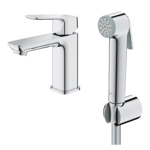 This stylish set includes a sustainable GROHE Cubeo basin tap and a functional trigger spray shower set – all finished in elegant chrome.